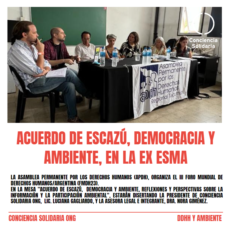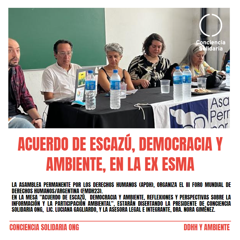 «En nuestro caso, tuvimos el honor y la enorme responsabilidad de representar a Conciencia Solidaria ONG, que presido, junto a nuestra compañera y Asesora Legal, la Dra. Nora Giménez, profundizando sobre las Causas que llevamos adelante sobre DDHH y Ambiente, puesto que son inseparables». Declaró la Presidente la ONG, Lic. Luciana Gagliardo, y continuó: «La mesa en la que participamos, ‘Acuerdo de Escazú, Democracia y Ambiente, reflexiones y perspectivas sobre la información y la participación ambiental’, dicho Acuerdo, que viene a formar, con status complementario a nuestra Carta Magna, una coraza de respaldo para proteger a los protectores del Ambiente y los Derechos, garantizando, paralelamente, a cualquier ciudadano de la región, el acceso a la información pública y ambiental, la participación ciudadana activa en la toma de decisiones, y un genuino acceso a la justicia, que implica, necesariamente, operar en tiempo y forma, y que las decisiones tomadas en ese ámbito, sean realmente, cumplidas».